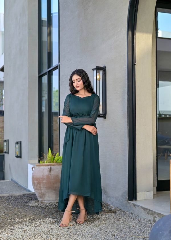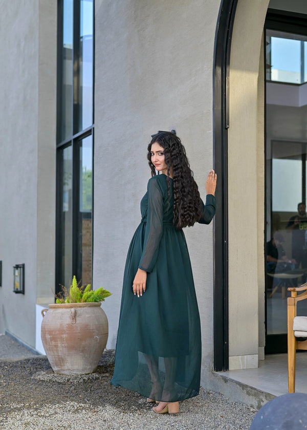 Design: An elegant and flowing maxi dress in a captivating deep jade hue, featuring a classic round neckline and a high-low hemline that adds a contemporary and graceful silhouette. The dress is designed for fluid movement and sophisticated drape. Sleeves: Full-length sheer sleeves with a relaxed fit, gathering gently at the cuffs, contributing to the dress's ethereal charm. Waist Detail: A subtly cinched waist with a self-tie belt allows for an adjustable and flattering fit, enhancing the dress's graceful flow.